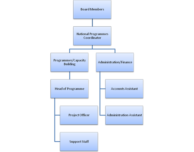 The Board Committee is responsible for the running of the organization through a secretariat that is headed by the National Programme Coordinator, Programme / Capacity Building Officers, Finance and Administration officer and support staff.